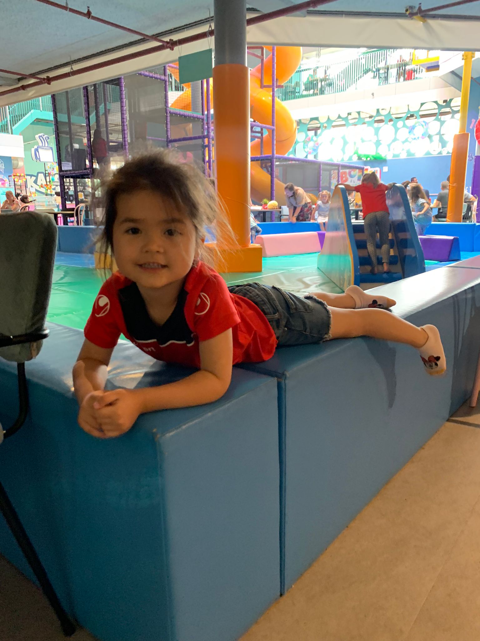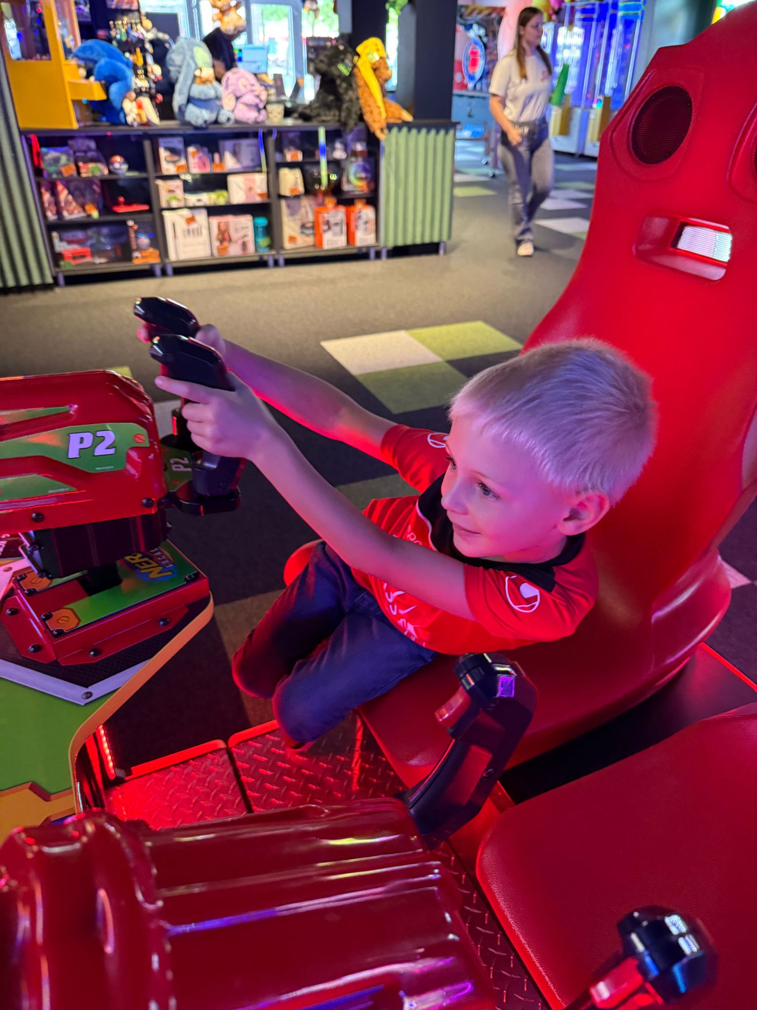 Om kwart voor twee vertrokken we naar de gamehal 🎮: Arcade King Kong 👾🦍. Wat een avontuur! Toen we terugkwamen, hebben we buiten op het gras een rijstwafel en cracker gegeten 🍘🌱. Daarna konden we nog even fijn vrij spelen tot papa’s en mama’s kwamen 🚗.