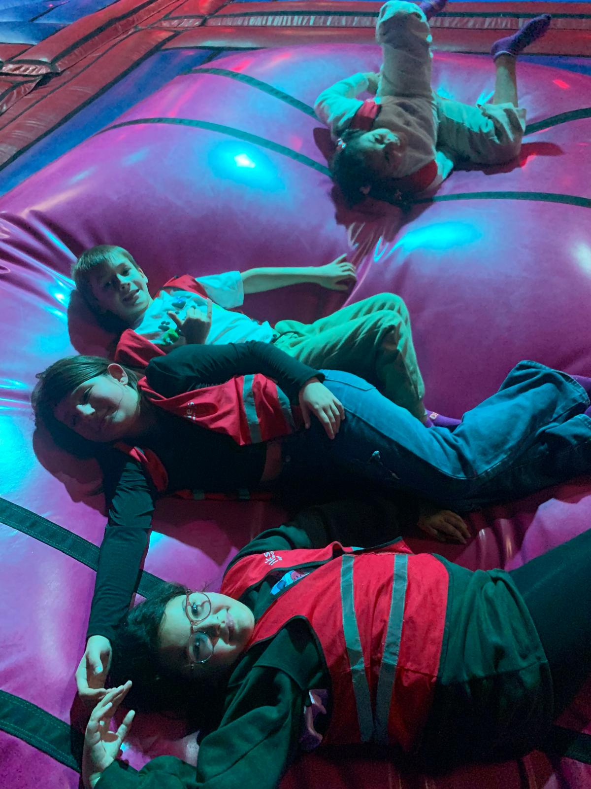 Na de Bingo was het tijd voor iets actiefs! De kinderen stapten in de bus en gingen naar Bounce Valley, een superleuke trampolinehal. 🦘 Daar konden ze springen, stuiteren en leuke trucs uithalen op de trampolines. Ze gaven elkaar high-fives en maakten de gekste sprongen.
