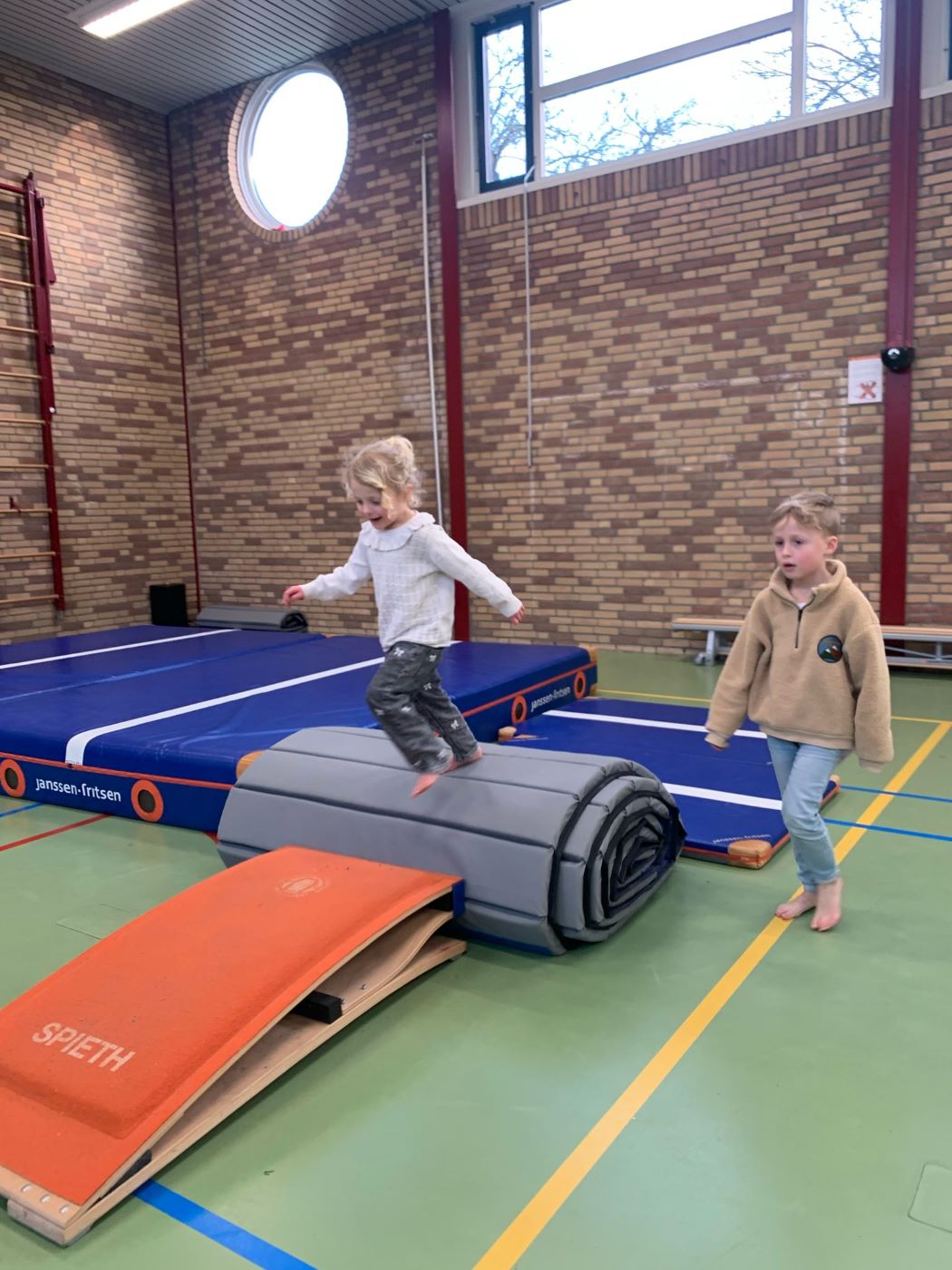 Daarna was het tijd voor actie. We gingen naar de sporthal en begonnen met een fanatiek potje voetbal. ⚽ Het ene team probeerde de andere te slim af te zijn en er werden mooie doelpunten gescoord. Daarna haalden we de springplanken tevoorschijn en sprongen we zo hoog als we konden. Sommige kinderen deden zelfs kleine trucjes in de lucht!