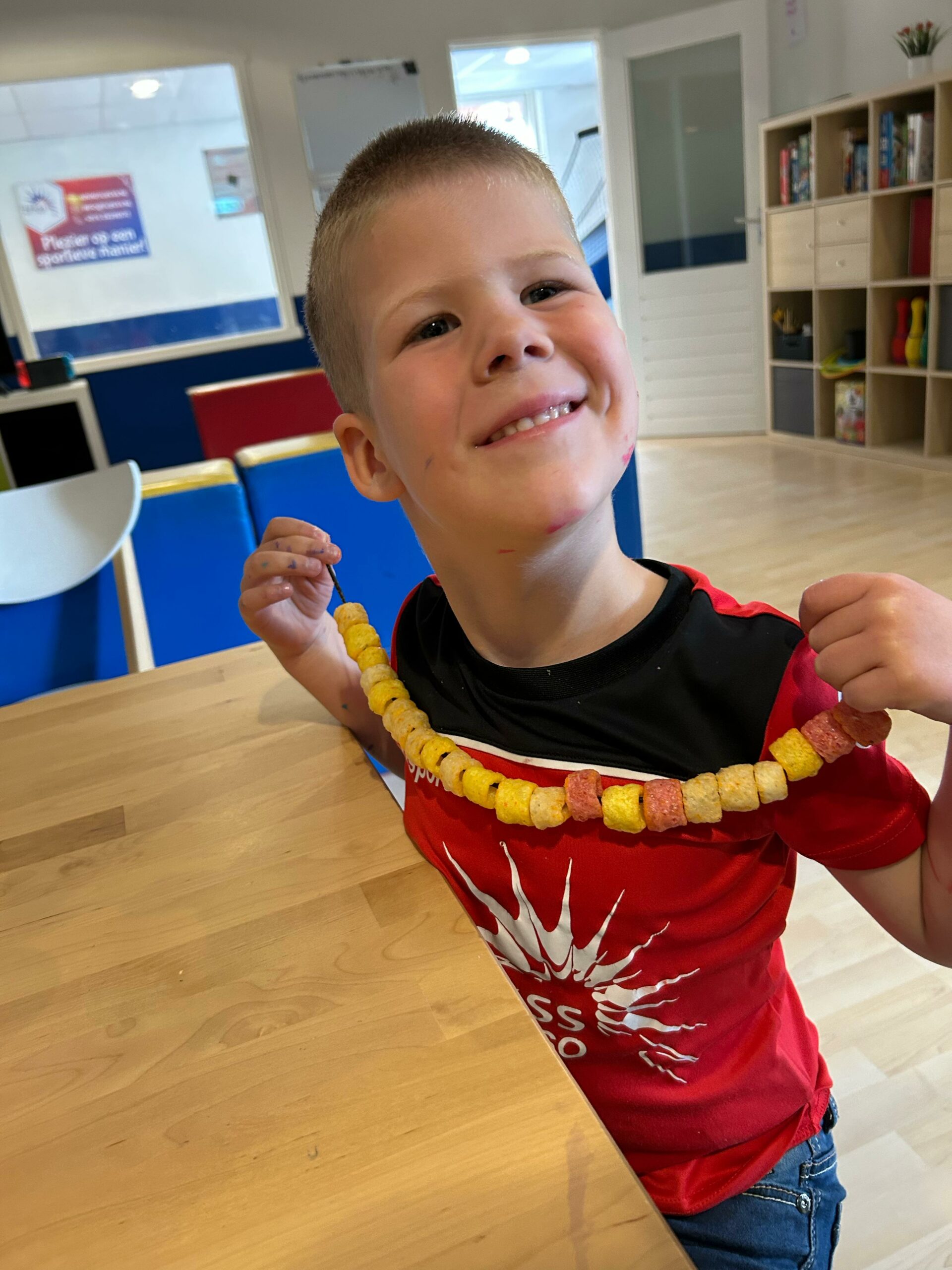 Eén van de kinderen was jarig en had een heerlijke traktatie bij zich: dropveters waar je chips aan kon rijgen. 🎉