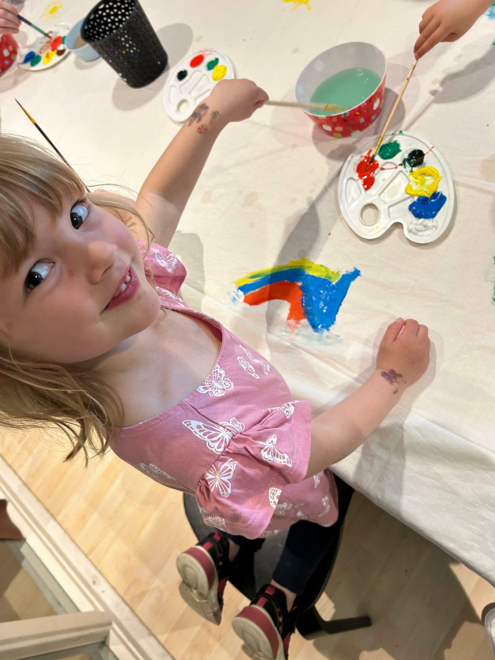 Na terugkomst bij de BSO zijn we gezellig gaan lunchen. 🥪🧃 Daarna hebben we samen een prachtig kunstwerk gemaakt met verf op een groot wit doek.