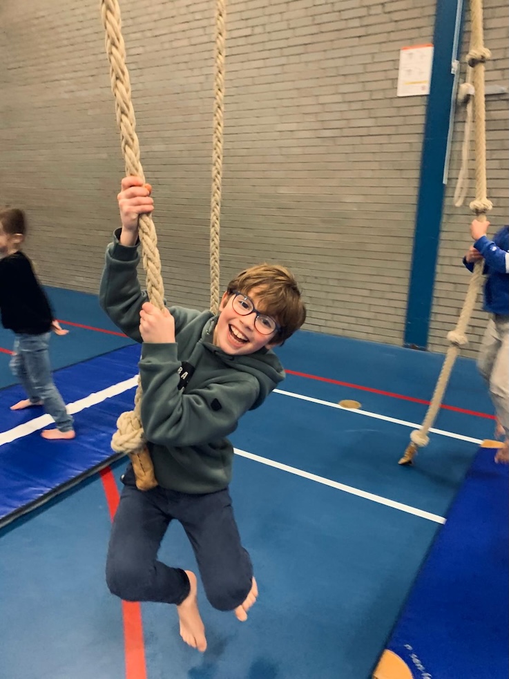 De kinderen vinden deze activiteit helemaal geweldig! Verschillende ren routes uitzetten, touwen uithangen, schommel ophangen en de dikke matten klaar leggen… en dan kan het sport uur beginnen🥳