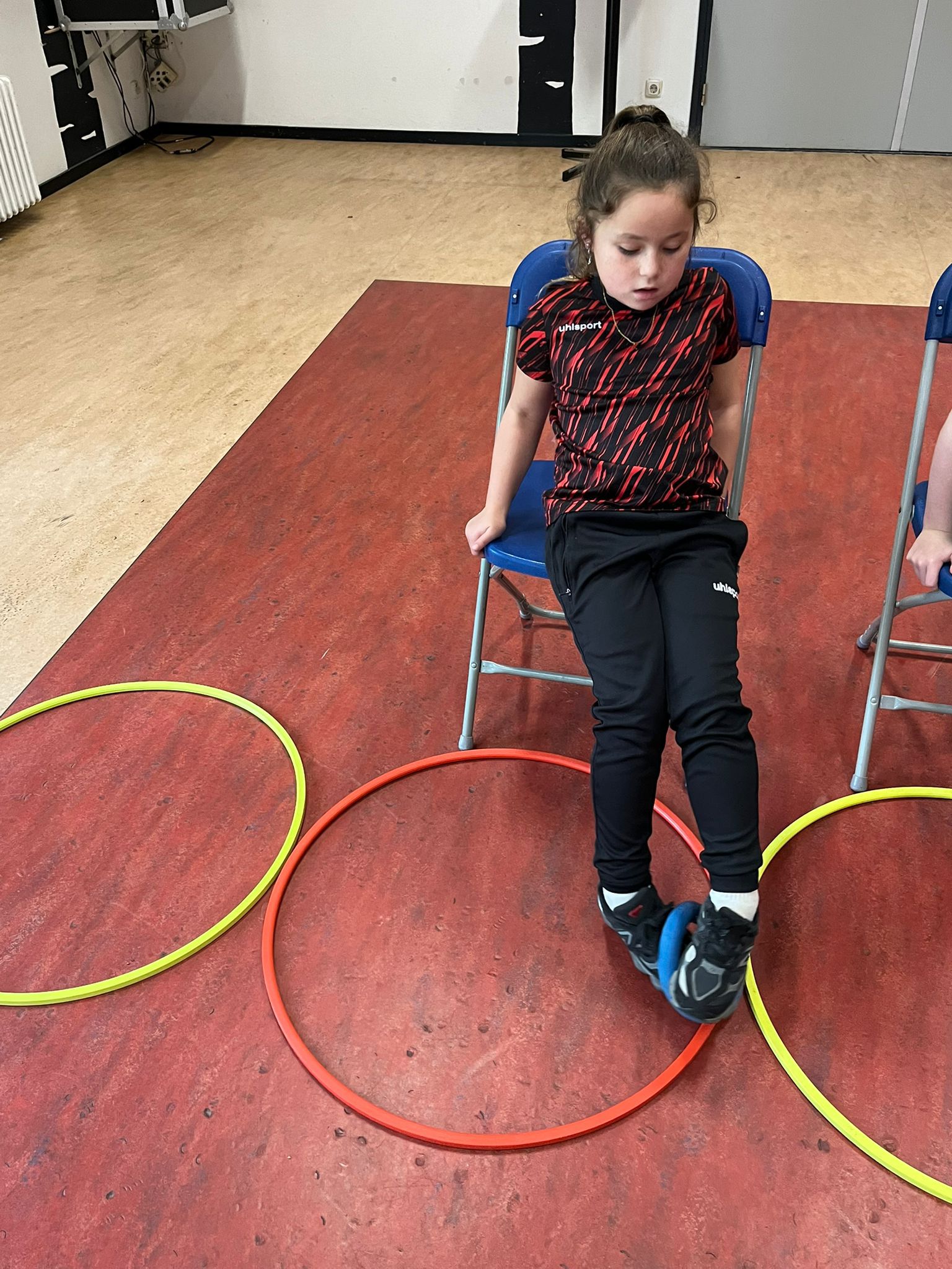 We deden een samenwerkingsspel met de voeten waarbij we in wedstrijdvorm zo veel mogelijk voorwerpen moesten doorgeven zonder het te laten vallen 😅.