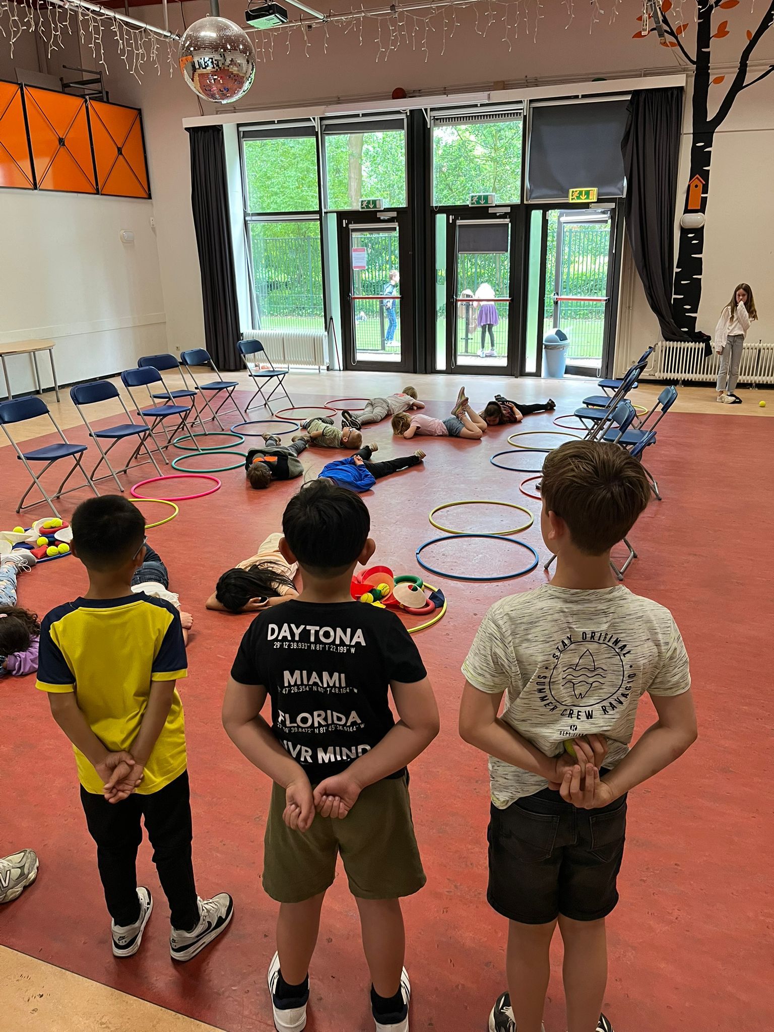 Nadat we onze energie aan hadden gevuld met wat te eten en te drinken 🍌🥛, hebben we een leuk samenwerkingsspel gedaan in de gymzaal.