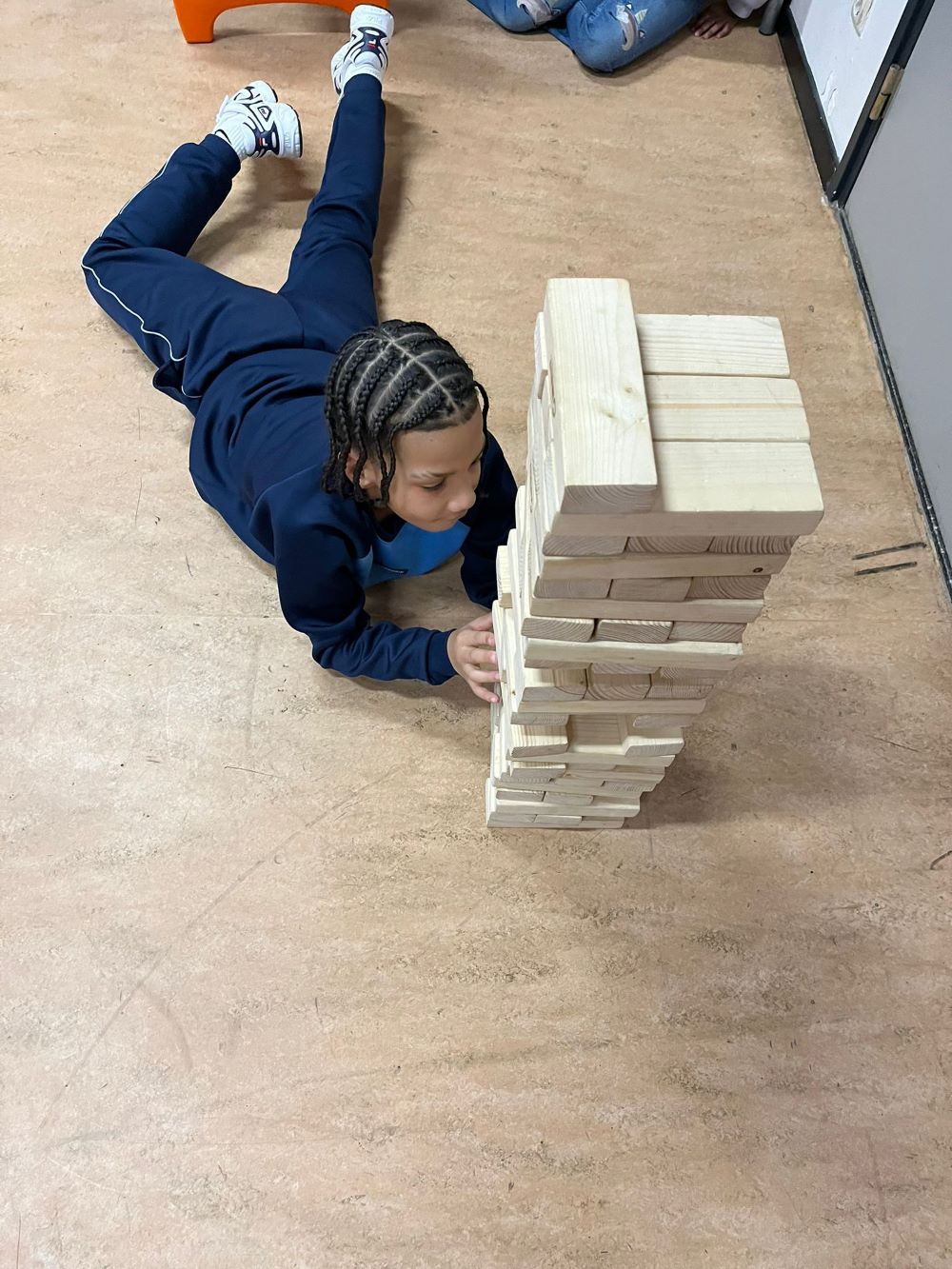 Het volgende spel was XXL jenga, hierbij gingen ze als groepje proberen een zo hoog mogelijke toren te krijgen. Bij één groepje was hij zelfs zo hoog gekomen dat hij even hoog was als de kinderen zelf.