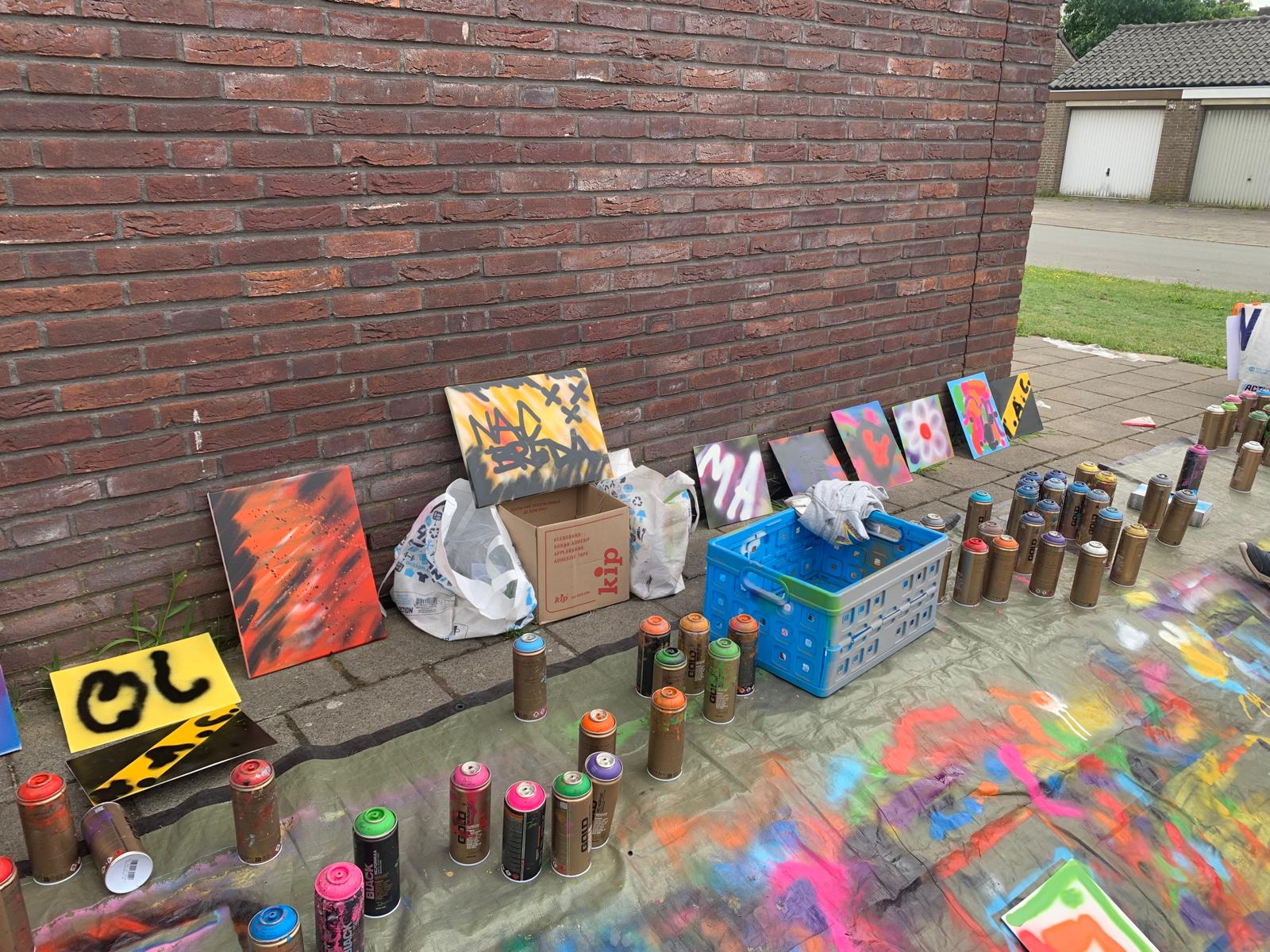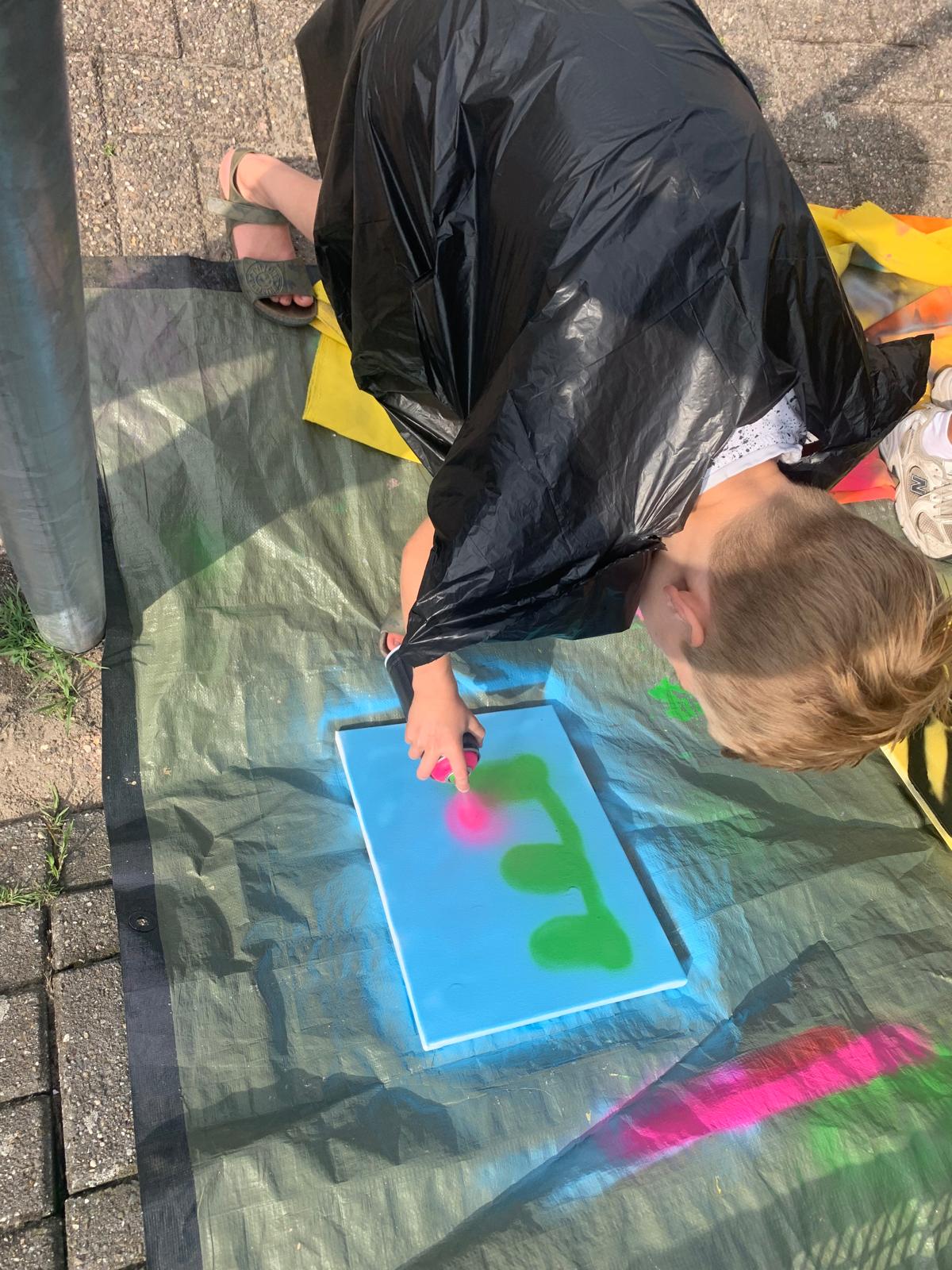 We begonnen de dag creatief met een graffitiworkshop 🎨. Met schorten en handschoenen aan gingen we aan de slag met spuitbussen. Iedereen maakte zijn eigen kleurrijke kunstwerk, en sommige verborgen talenten kwamen echt naar boven! In de middag trokken we naar het sportpark 🏃♂️. Daar werd geduikeld op het rek, gevoetbald op het veldje en in het bos hutten gebouwd 🌳.