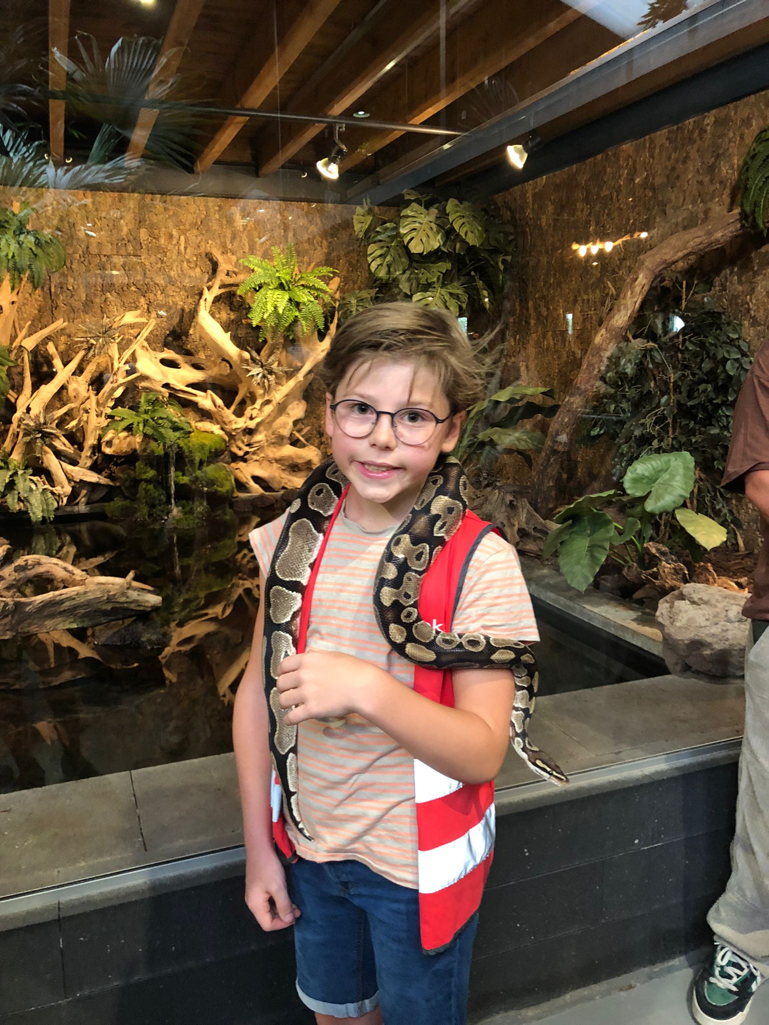 ’s Ochtends genoten we in de speeltuin 🛝: voetballen ⚽, schommelen op de familieschommel en glijden van de glijbaan. In de middag werd het een bijzonder avontuur bij Reptielenhuis De Aarde 🦎🐍. Daar mochten we een slang vasthouden én zelfs een reuze wandelende tak op onze hand laten lopen. Spannend, maar heel gaaf! 💚
