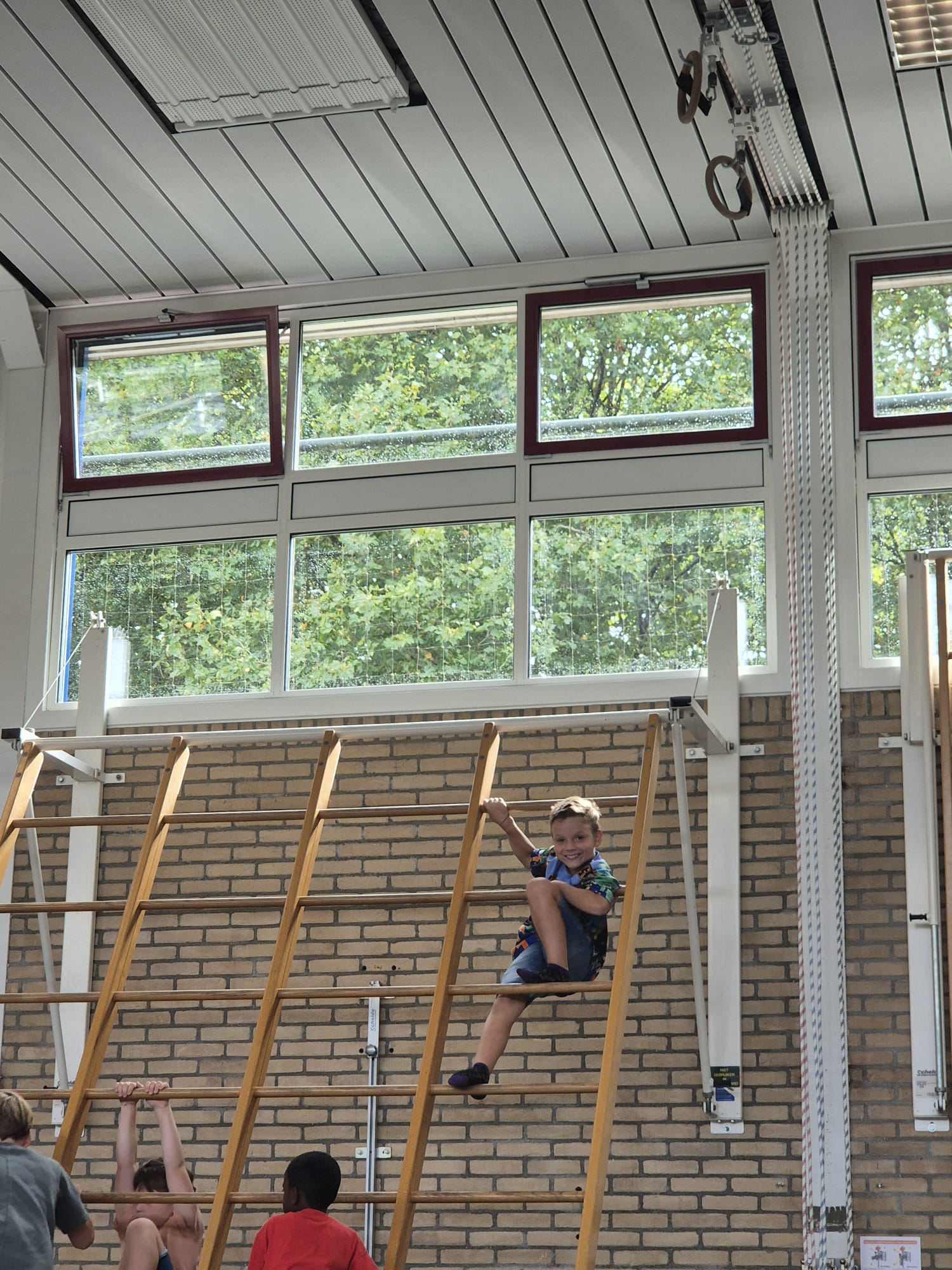 Omdat het weer wat wisselvallig was 🌧️, zijn we naar de gymzaal gegaan. Dat bleek een groot succes! De kinderen konden zich uitleven met voetballen ⚽️, klimmen in het klimrek 🧗 en basketballen 🏀. Een sportieve afsluiting van een week vol plezier en beweging!