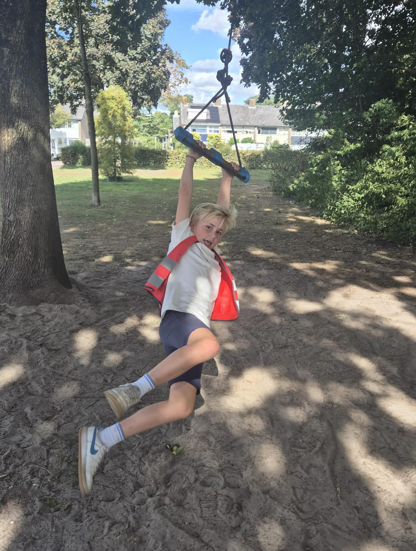 Na het fruiteten 🍎🍌 vertrokken we in overleg met de kinderen naar het bos 🌳. Daar bouwden we stevige hutten 🛖 en klauterden we over de obstakels. Hoogtepunt: de kabelbaan! 🙌💨 Iedereen gierde van plezier toen ze eroverheen suisten.