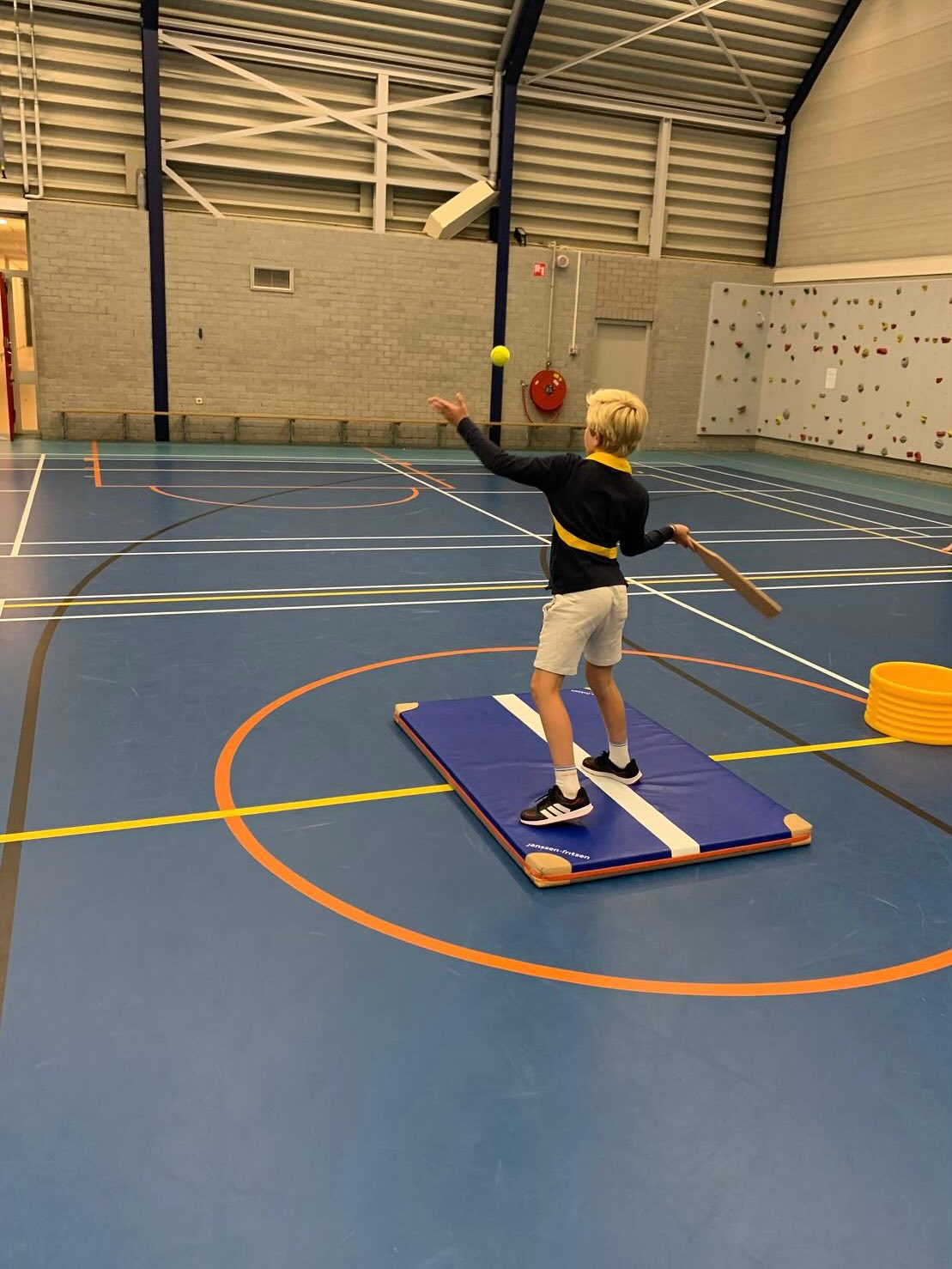 Het was helaas slecht weer 🌧️, dus gingen we opnieuw naar de gymzaal. Dit keer stond slagbal op het programma 🏏. Er werd fanatiek geslagen, gerend en aangemoedigd. De spanning was groot: welk team zou winnen? Iedereen gaf het beste van zichzelf en het werd een superleuke wedstrijd!