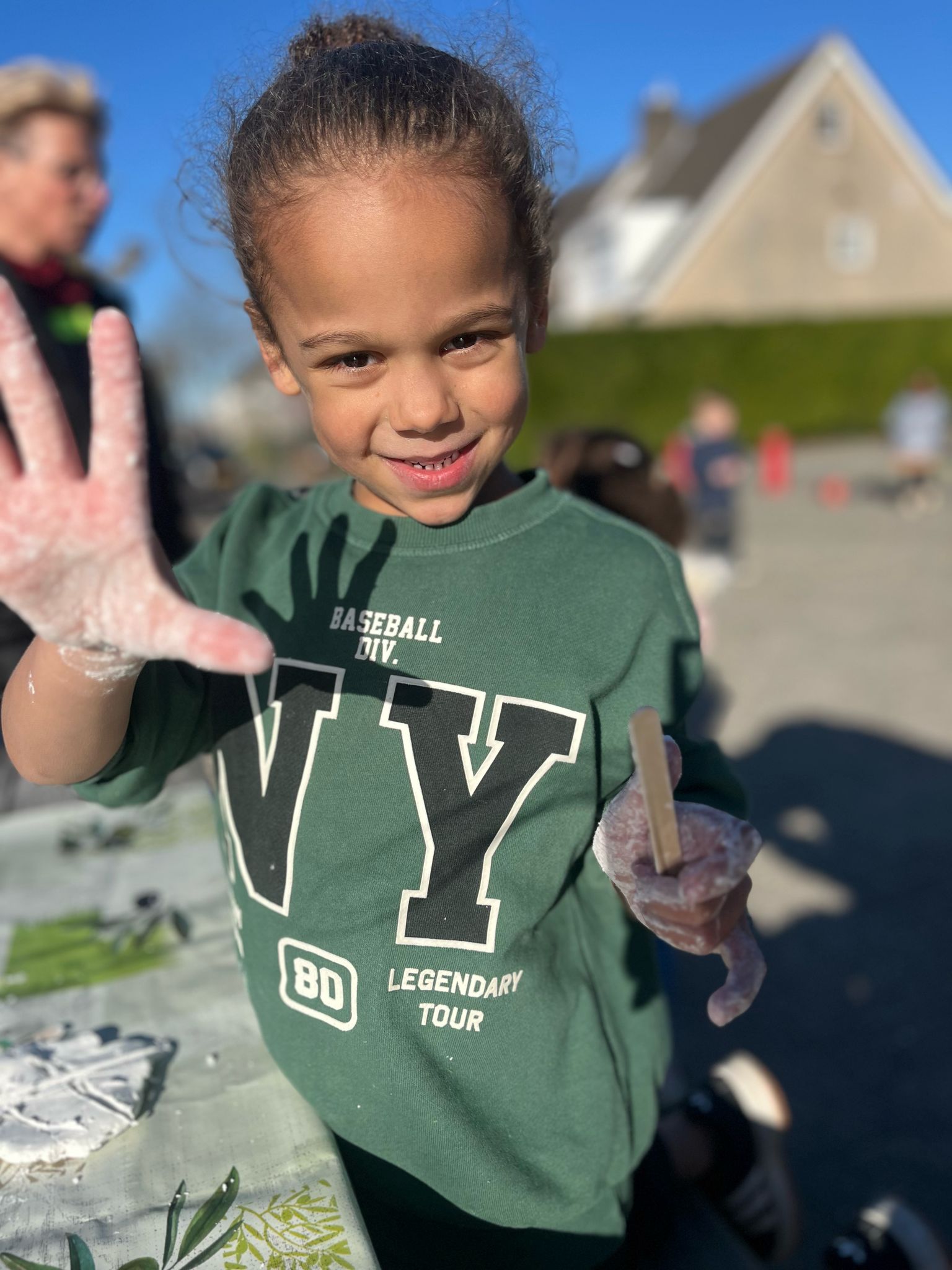 Vandaag zijn we begonnen met verven buiten omdat het zo mooi weer was ☀! Daarna hebben we heerlijk fruit🍇🍎 gegeten en zijn we verder gegaan met buitenspelen. Daarnaast kwam grote broer grote zus langs. Zij wilde twee super leuke spellen met ons doen in de gymzaal! Zo deden we het na doen spel. Daarbij mocht een kindje iets voordoen en moest de rest van de groep het na doen 🕺🏼. Daarna deden we het welbekende spel, vies land en lekker land. Zo noemde de juffen een product op wat je kan eten en mochten de kinderen naar de lekker kant rennen of naar de vies 🤢 kant. Het was een gezellige en warme middag! 🤩