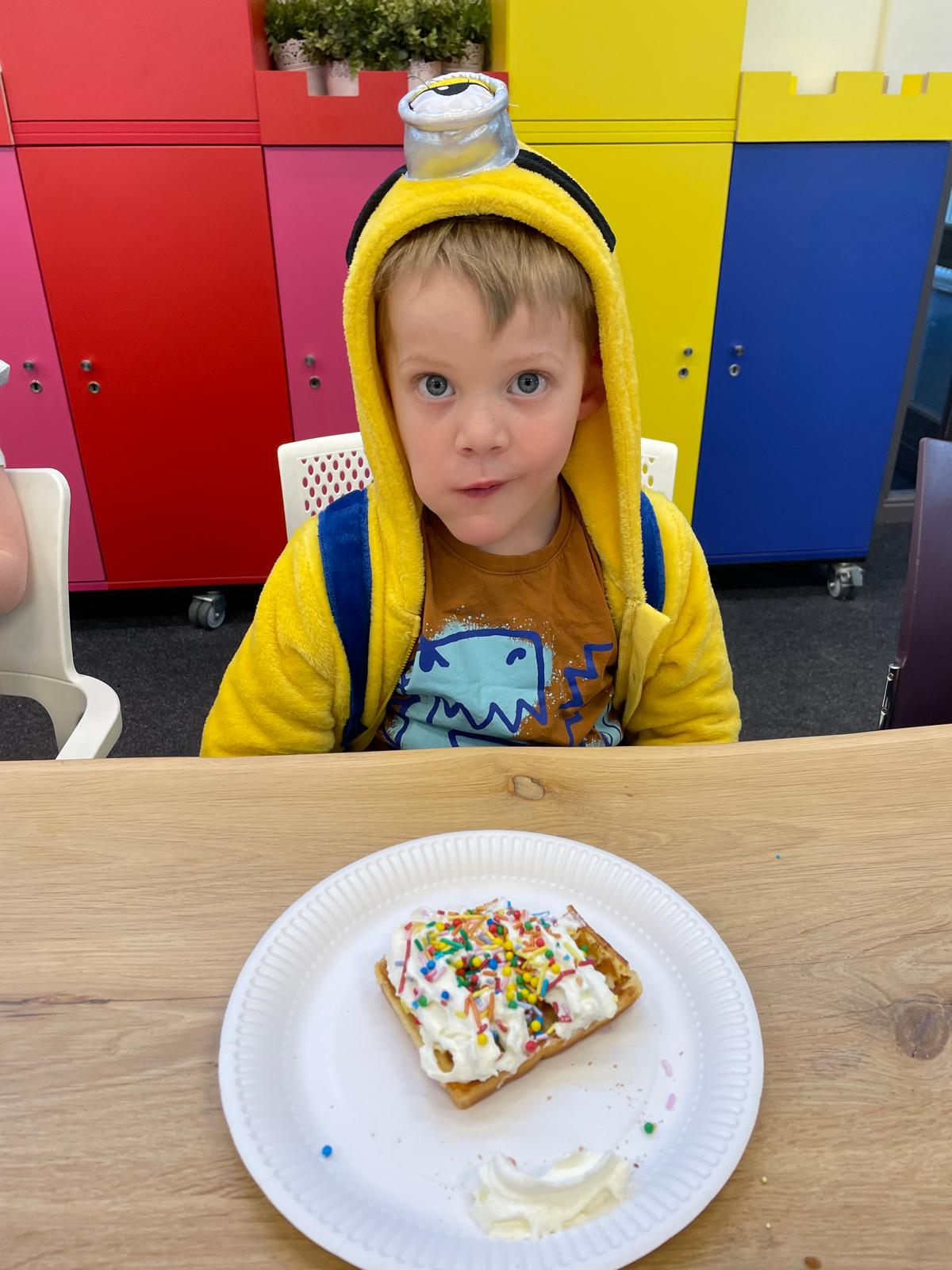 Tijd voor feest! 🎊 Vandaag stond carnaval centraal op de Zeggewijzer. We begonnen de dag sportief met polonaise trefbal en wie is prins carnaval trefbal 🏃♂️🤴. Daarna konden de kinderen hun eigen wafel versieren 🧇🍫 en prachtige carnavalsmaskers maken. 🎨🎭