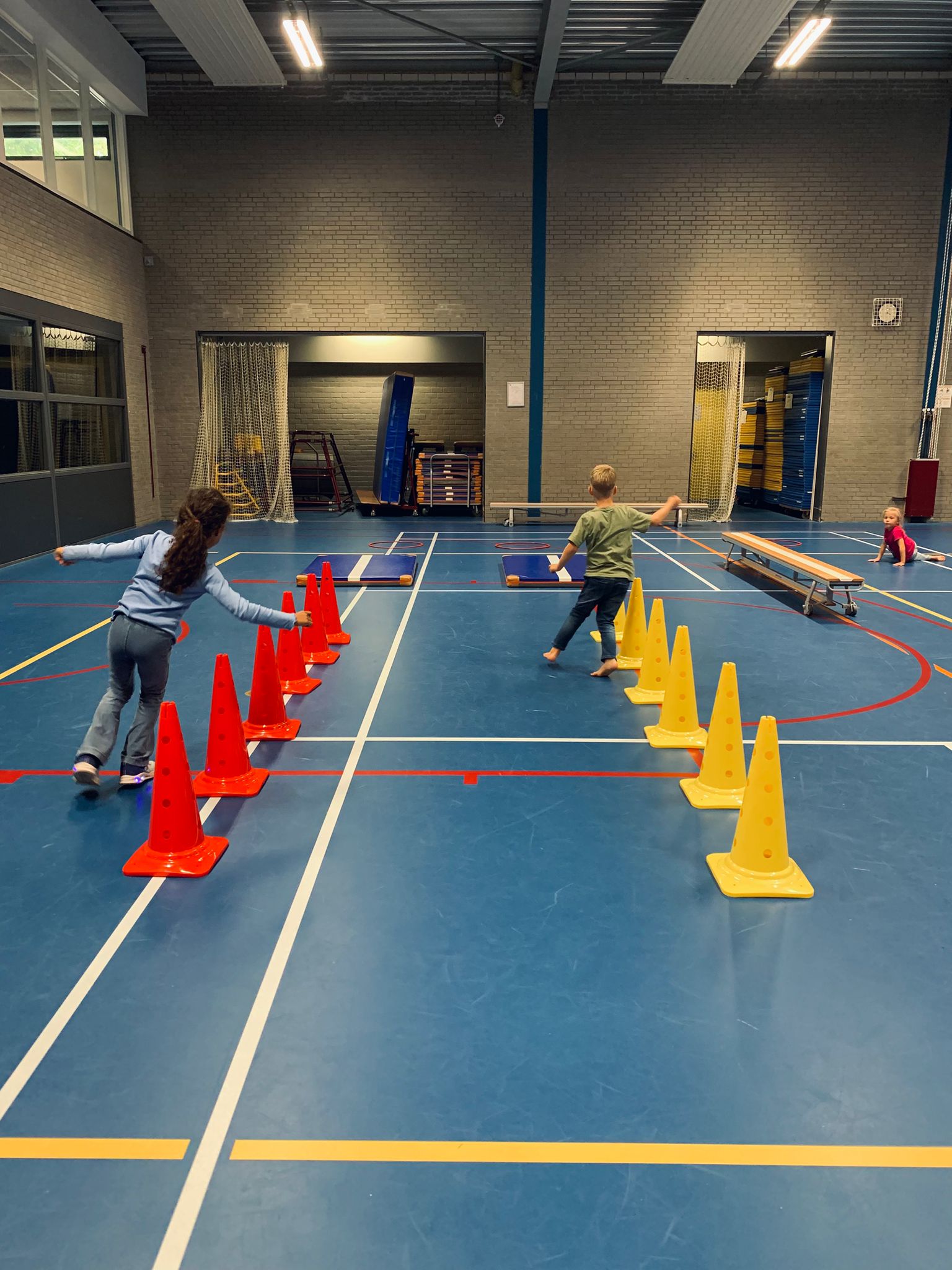 ’s Middags zijn we met alle kinderen naar de gymzaal gegaan. Hier hebben we een kleutervak en twee grote vakken gemaakt. In het kleutervak hebben we een estafette en ontwikkelingsspelletjes gedaan. In de grote vakken deden we een dobbelsteenstafette en het spel ‘materialen afpakken’.